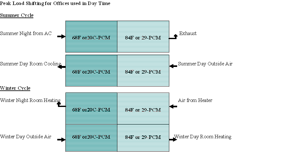 Peak Load Shifting for Offices used in Day TimeThe figure describes the night time charging and day time utilization process during both heating and cooling seasons for a storage system comprising of two different PCM integrated into a reverse cycle refrigerative heat pump system utilizing off peak power. Using a thermal storage system containing two different PCM can reduce the required capacity and the initial cost of air conditioner for a building. It also can shift a portion of the energy load (heating and cooling) to off peak hours, when electricity cost is lower.