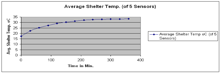 210 Kg of Latest29T PCM (10KWH) filled profiles were installed in an Existing BTS Basic Telecom Shelters of 2m Length by 2.5m width by 2.7m Height. Five thermometers were installed to measure temperature at various points. The Air-condition was switched off when the temperature was 17.3°C. Ambient temperature was also measured. The battery voltage was observed as per the instruction of the site-officer. The permissible maximum temperature that can be reached was targeted to 36°C. This temperature was not reached in 6 Hours of the run. In a blank reading with-out Latest29T PCM the target maximum temperature crossed in less than 1 hour.